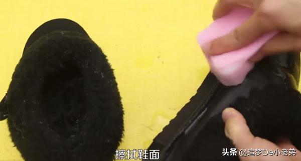 喷上翻毛皮鞋专用的干洗剂,用刷子反复刷洗鞋面,直至干净为止。再用湿布擦掉剩余的泡沫,你会发现,此时的鞋面已经焕然一新了,用吹风机把鞋子吹干,一双崭新干净的鞋子就诞生了。