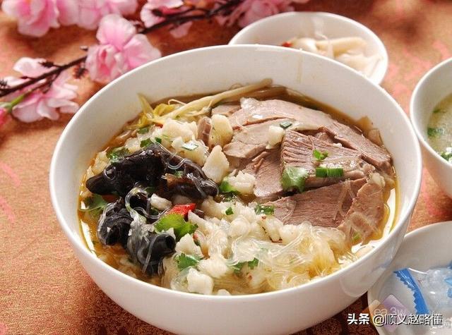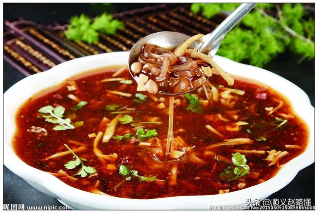 十、糊辣汤,胡辣汤,又名糊辣汤,中原知名小吃,起源于河南省周口市西华县逍遥镇及漯河舞阳县北舞渡镇,是中国北方早餐中常见的传统汤类名吃。胡辣汤的主要制作材料有胡辣汤料、胡椒、辣椒、熟羊(牛)肉、羊骨高汤、面筋、面粉、粉条、黄花菜、木耳等