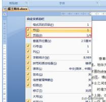 2、很简单,在左下角显示的“行”、“列”、“字数”任一项上点击鼠标右键,然后鼠标左键选中弹出窗口的“节”和“页面”即可。
