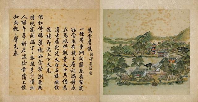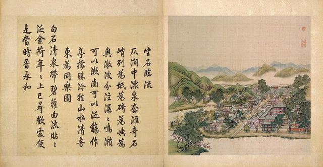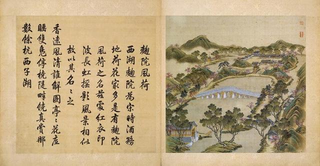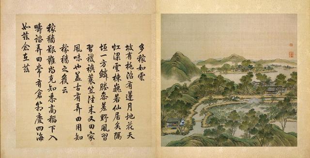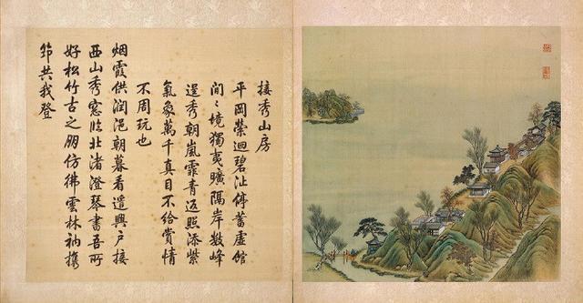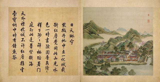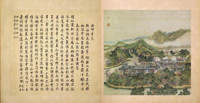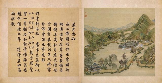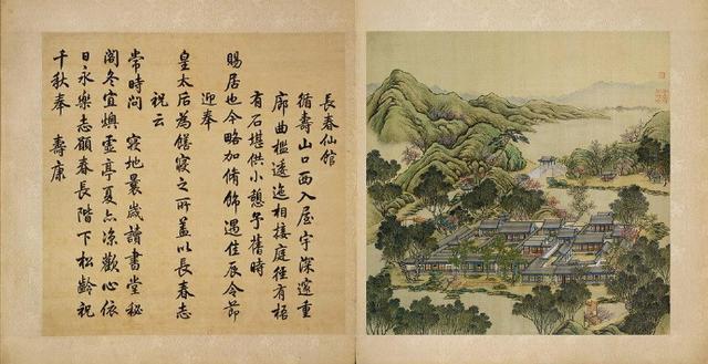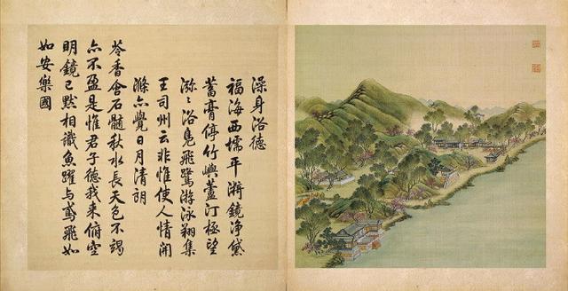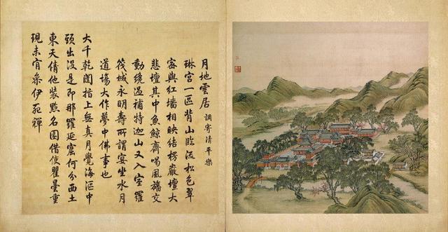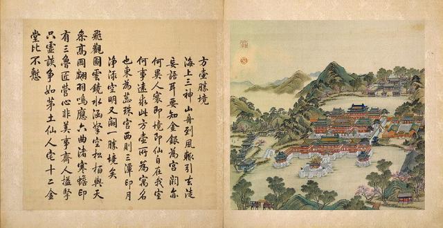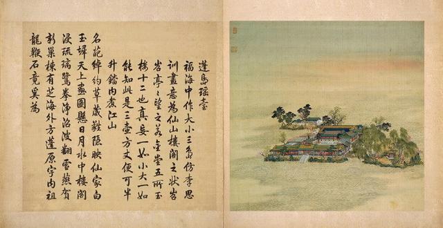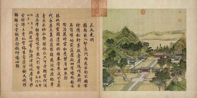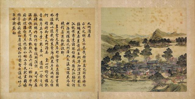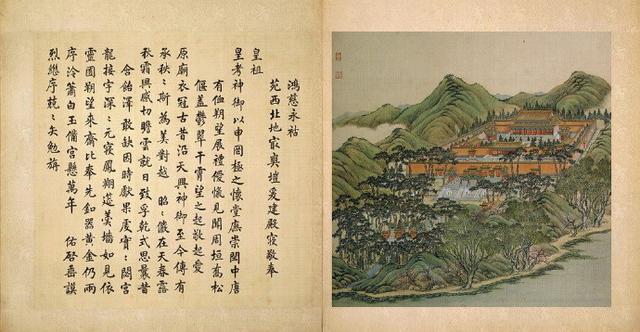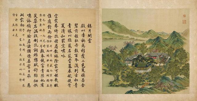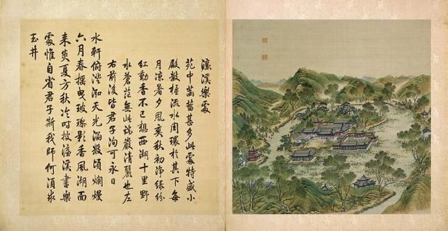 《圆明园四十景图》清代乾隆年间宫廷画家沉源、唐岱绘,绢本彩色,画面宽二尺零四分,高二尺,连装池梭边共宽二尺三寸五分,高二尺六寸,合四十幅;另有汪由敦楷书弘历所作各景题咏四十首,亦四十幅,总共八十幅,为两册。原存圆明园中,1860年被英法联军劫掠,现收藏于法国巴黎国家图书馆。