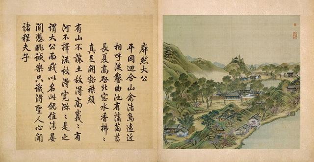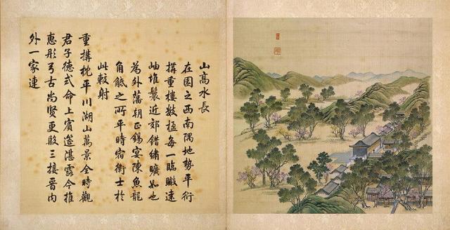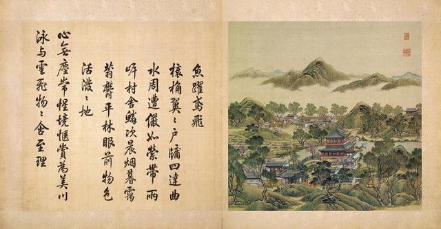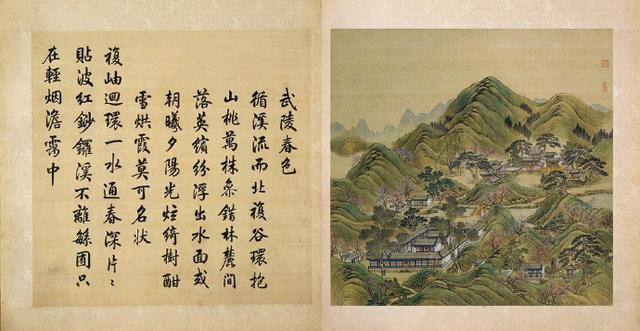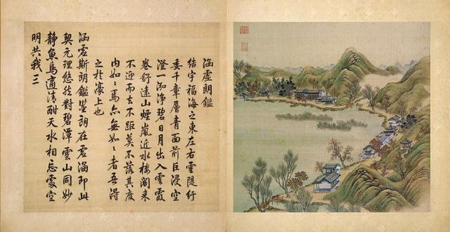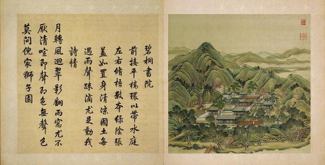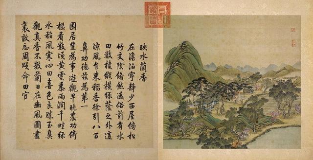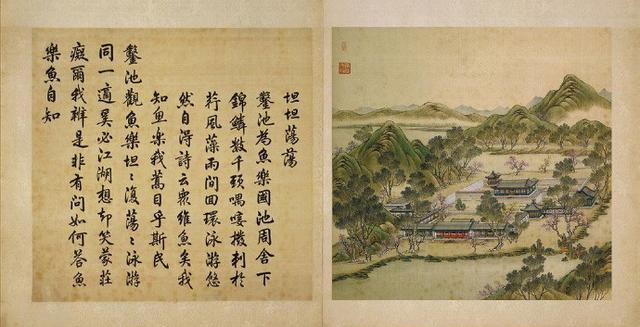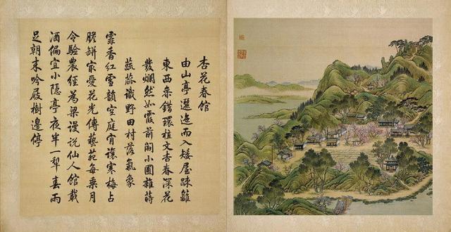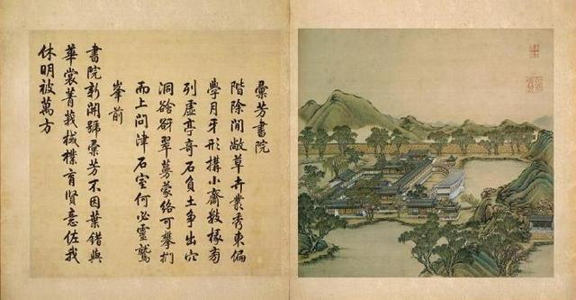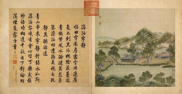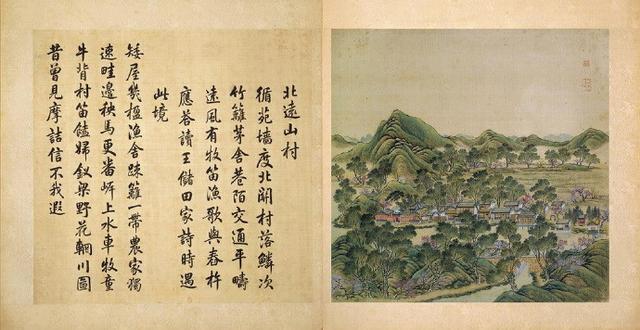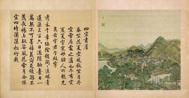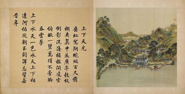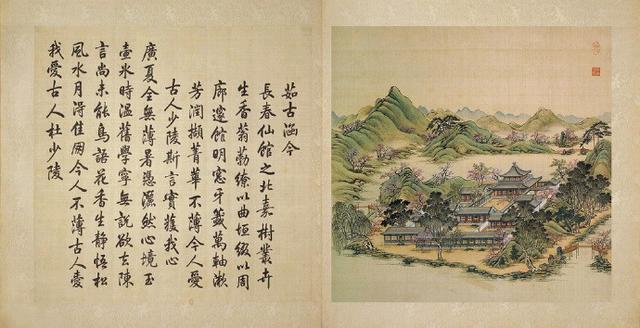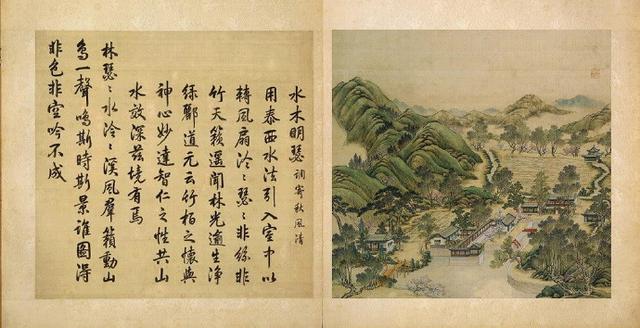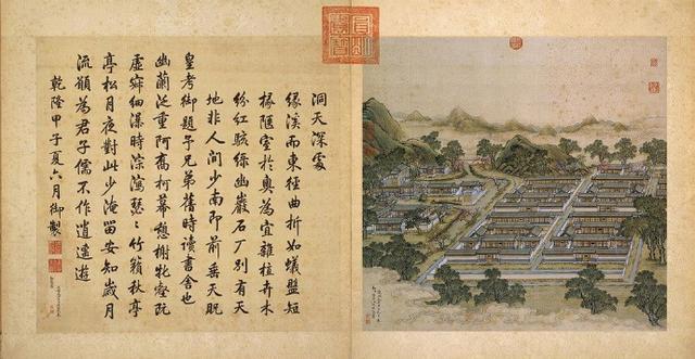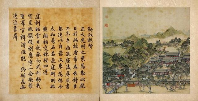 《圆明园四十景图》清代乾隆年间宫廷画家沉源、唐岱绘,绢本彩色,画面宽二尺零四分,高二尺,连装池梭边共宽二尺三寸五分,高二尺六寸,合四十幅;另有汪由敦楷书弘历所作各景题咏四十首,亦四十幅,总共八十幅,为两册。原存圆明园中,1860年被英法联军劫掠,现收藏于法国巴黎国家图书馆。