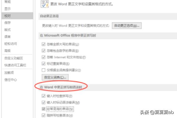 5、接着我们可以看到”校对“选项卡的右边有对应的选框,这些都是有勾的。