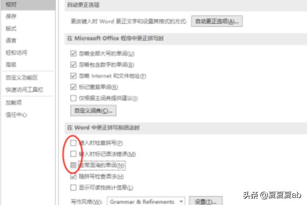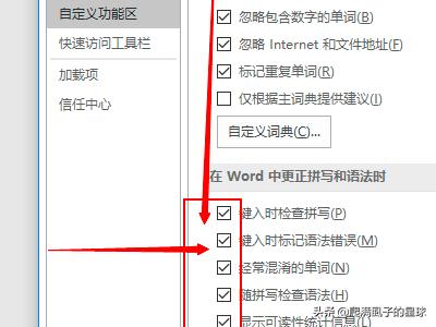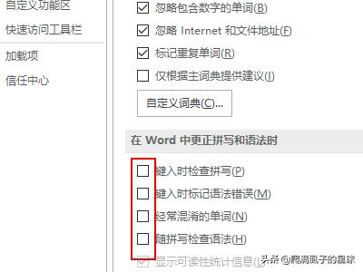 4、”在Word中更正拼写和语法时“下的前三个选项,都是被勾选的,所以才会出现虚线的情况。