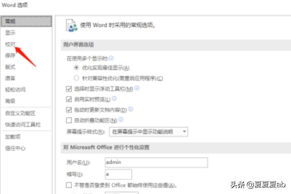 4、选择“选项”子菜单之后,就会弹出这样一个窗口,选择其中的”校对“选项卡。