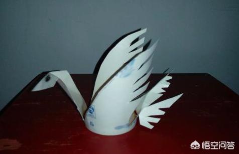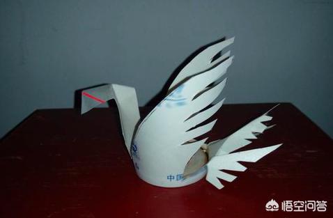 7、翅膀与尾巴部分的羽毛样子剪出来后,适当调整下尾巴与头部的位置,使其向下弯曲有一定弧度。没特殊要求,这里注意头部从中间折叠下,再在合适位置反折叠,以这出头的样貌。后在头部红线处使用剪刀剪除。