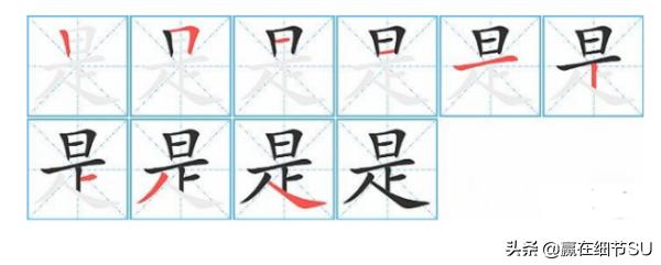 “是” 字共有 9 画,笔画顺序为: 竖、横折、横、横、横、竖、横、撇、捺。