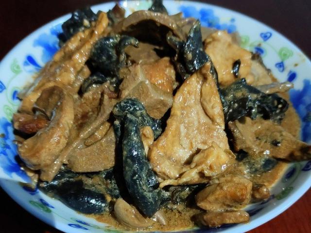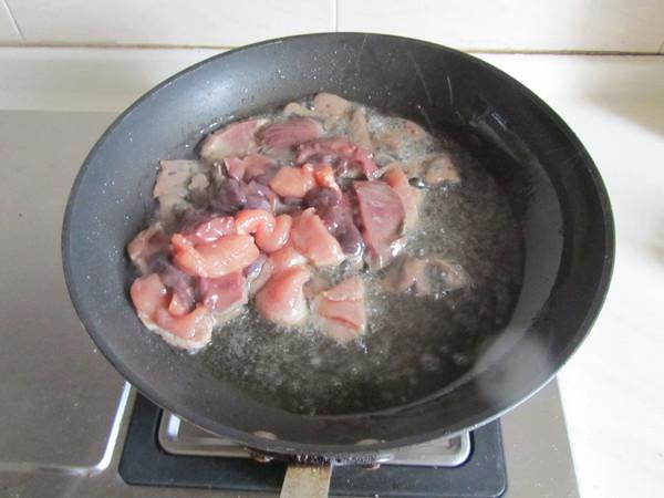 锅中倒入比平时多点的油, 下入猪肝猪腰里脊肉三样原料滑炒