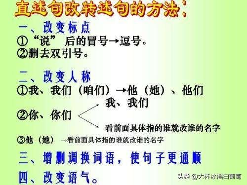 1.引述是直接引用别人的话,而转述则是转达别人说的话, 因此,引述句改为转述句时,说话人即第一人称“ 我 ”要改 为第三人称“ 他 ” 或“ 她 ”。