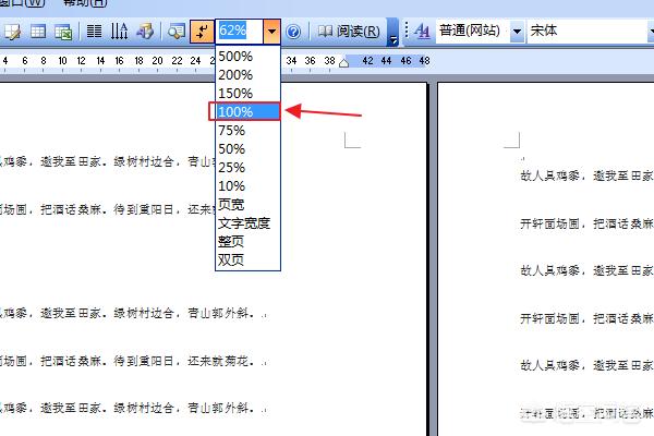4、若想变回去,则再次点击百分比,在此下拉框中点击选择“100%”选项,然后就会自动变回单页。