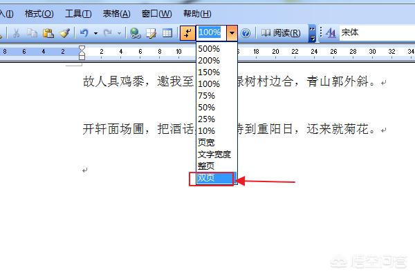 3、然后就会出现一个下拉框,在此下拉框中点击选择“双页”选项,然后页面就会变成两个版面。