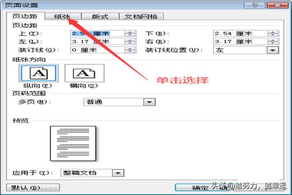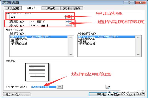 2.在进入页面设置主界面后,首先对纸张类型进行设置,点击上方菜单栏中的【纸张】,然后,选择相应的纸张大小、高度和宽度,并选择应用范围;