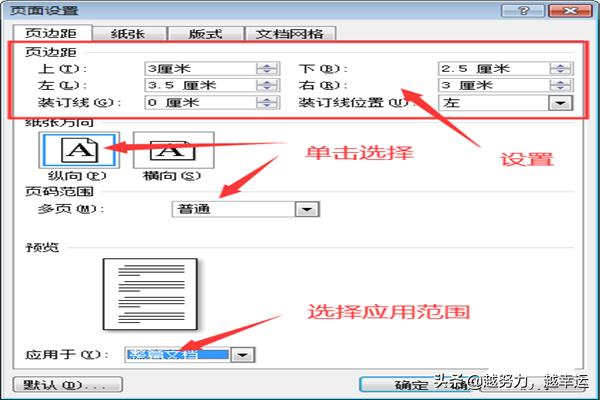5.在档网格进行设置完毕后,对页边距进行设置,点击上方菜单栏中的【页边距】,然后,对页边距、纸张方向以及页码范围进行设置,并选择应用范围;