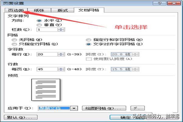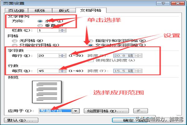 4.在版式格式设置完毕后,对文档网格进行设置,点击上方菜单栏中的【文档网格】,然后,对文字排列、网格、字符数以及行数进行设置,并选择应用范围;
