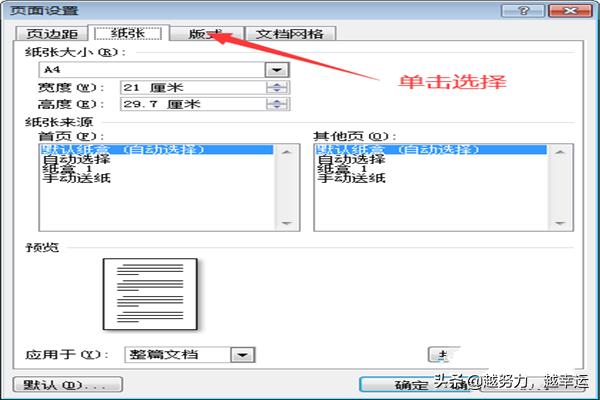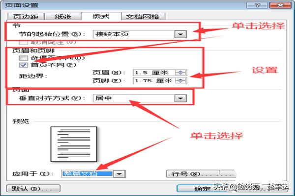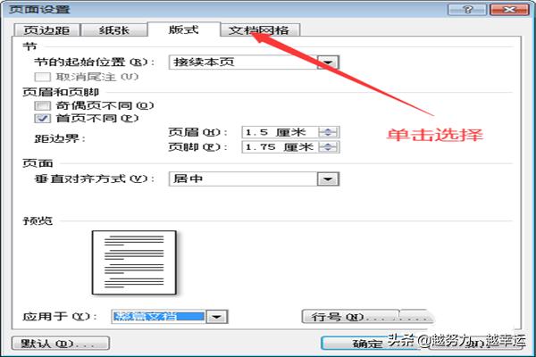3.在纸张格式设置完毕后,对纸张版式进行设置,点击上方菜单栏中的【版式】,然后,对节、页眉和页脚以及页面垂直对齐方式进行设置,并选择应用范围;