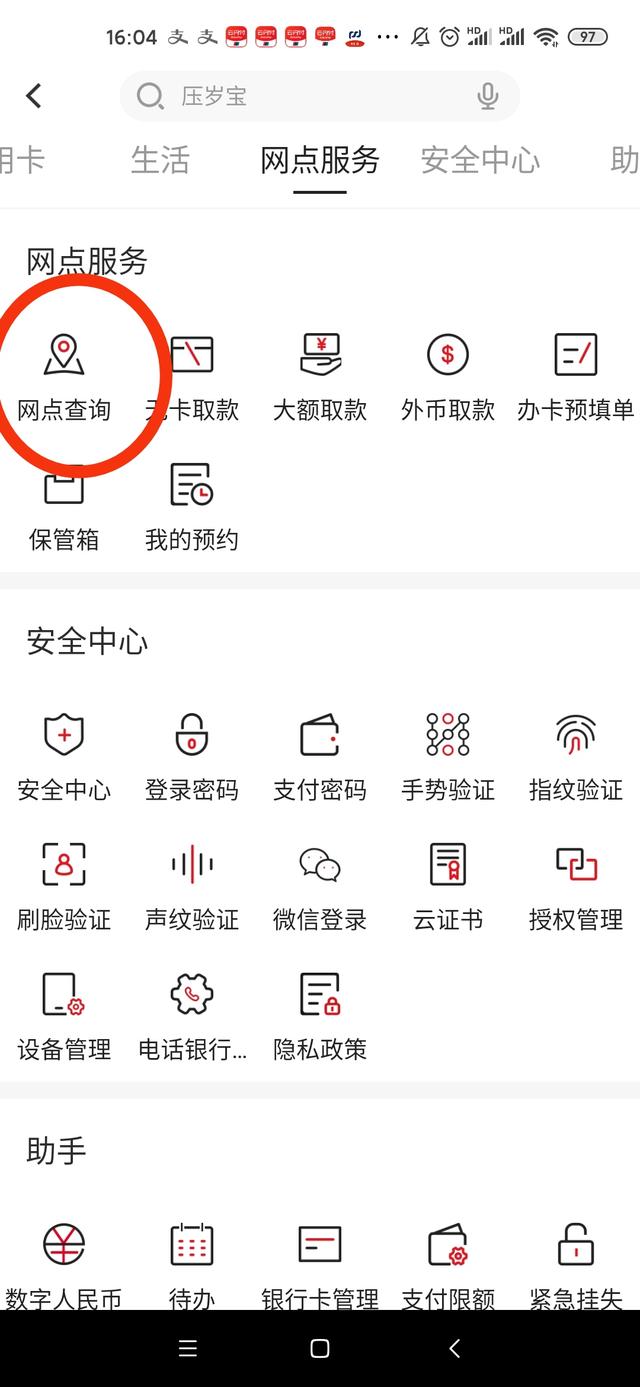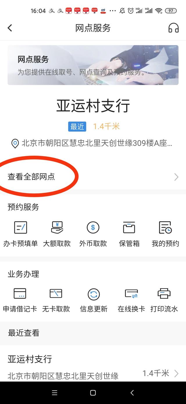 下面有网点查询,点击进入,可以看到离你最近的营业网点,下面有个查询全部网点,如图: