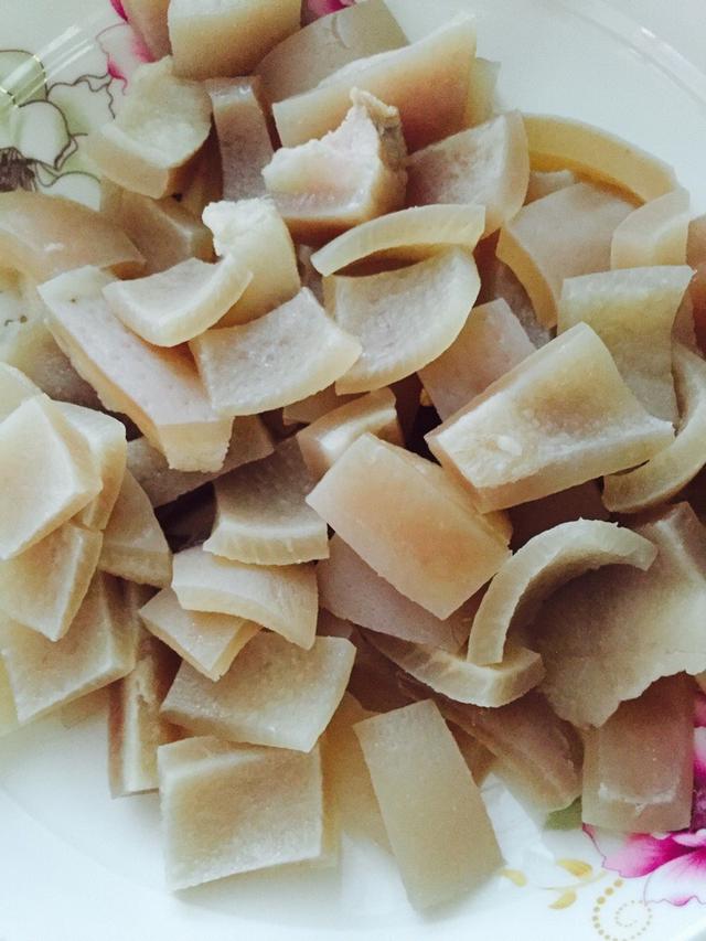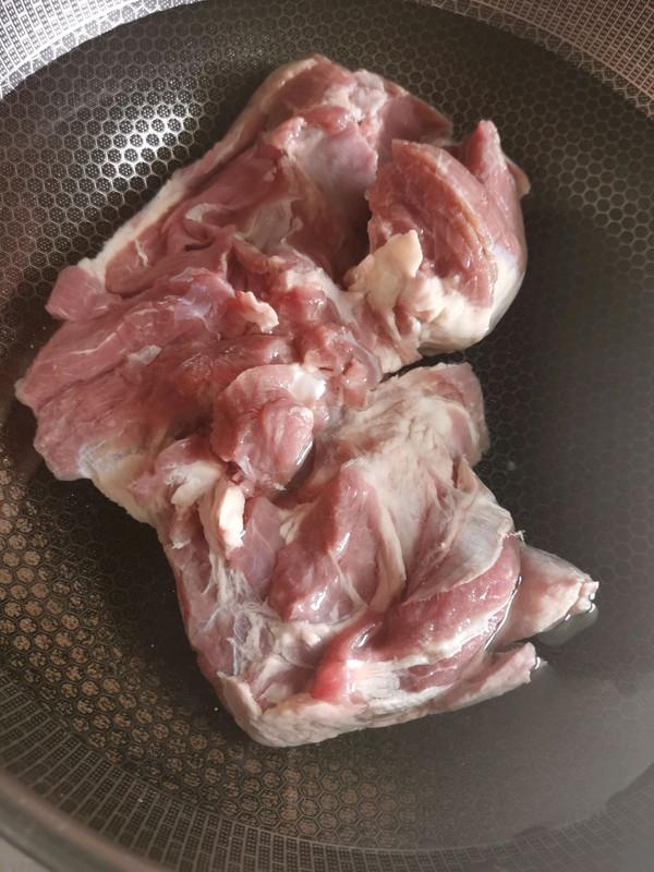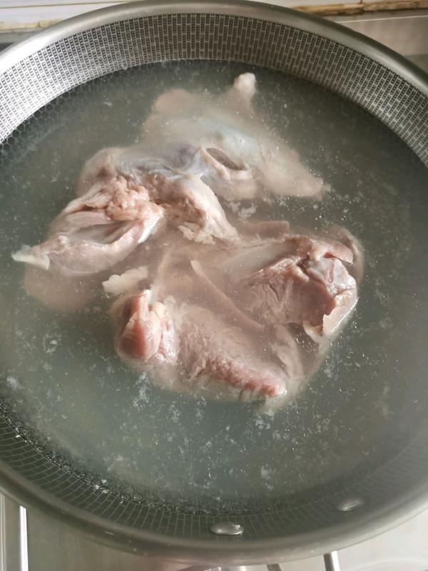 1、将带皮羊后腿肉、猪肉皮毛根去除干净,将羊肉用清水浸泡去除血水,多换几次水,清洗干净,然后放入开水锅中焯煮一下,主要目的是去尽其血污,有利于去除膻味,捞出后要用清水冲洗干净,待用;将白萝卜去皮后切成大块。