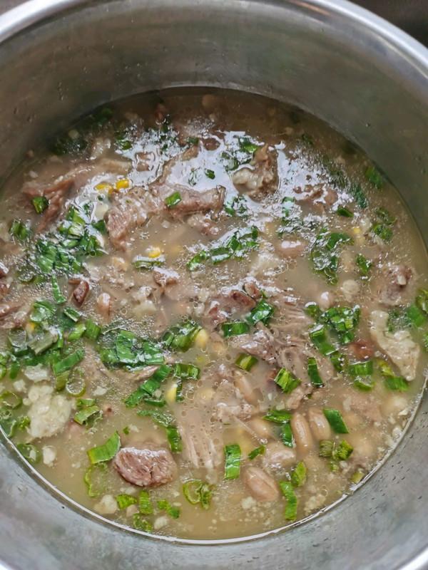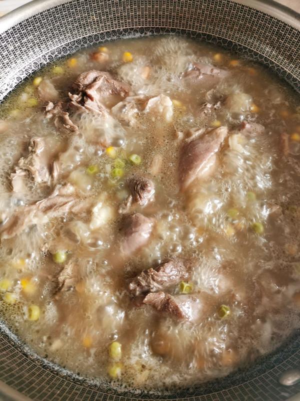 两个小时之后,把锅里除了羊肉以外,所有的调味料都捞出来,然后里面加入喜欢的黄豆玉米,花生青豆等,水开以后继续小火焖煮半个小时即可