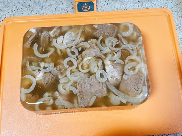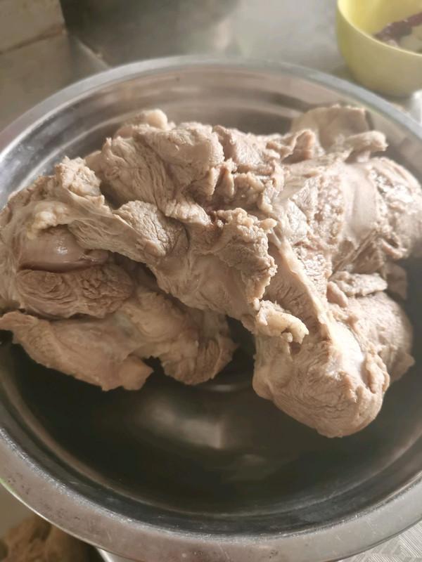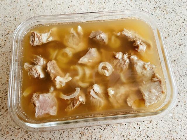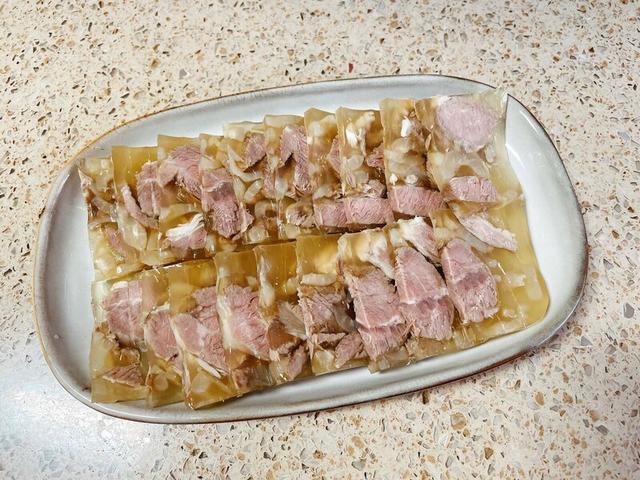 3、将煮熟的羊肉捞出后放在盆中,用手摊平,将锅内汤汁过滤去掉猪肉皮、萝卜块、和调料包以及杂质,将过滤干净的汤汁倒在羊肉盆内,冷却后放入冰箱内冷藏凝固,如果是冬天不需要放入冰箱也可以凝固,食用时取出,切成条状或片状,装盘上菜即可食用。