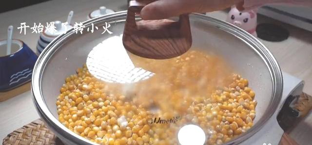 听到劈啪声后,转小火,此时不要掀锅盖,用手端起锅不停摇动,持续2-3分钟左右,直到声音逐渐变小,声音差不多消失后即可打开锅盖。这时候可以看到玉米粒已经爆成米花了,立即趁热加两勺糖,然后用铲子搅拌,待糖融化后沾到爆米花上即可关火。