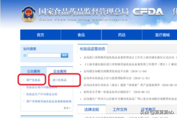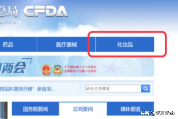 1、打开搜索“国家食品药品监督管理总局官网”点击进入官网,点击右上角的“化妆品”栏目。