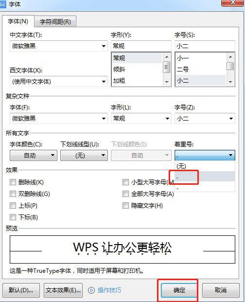 2、点击着重号下方选项框,选择“着重号”并点击下面的确定按钮即可。
