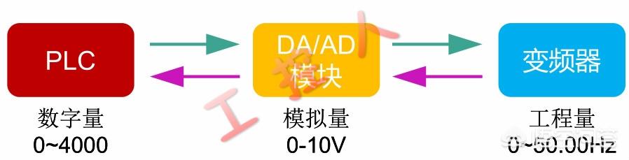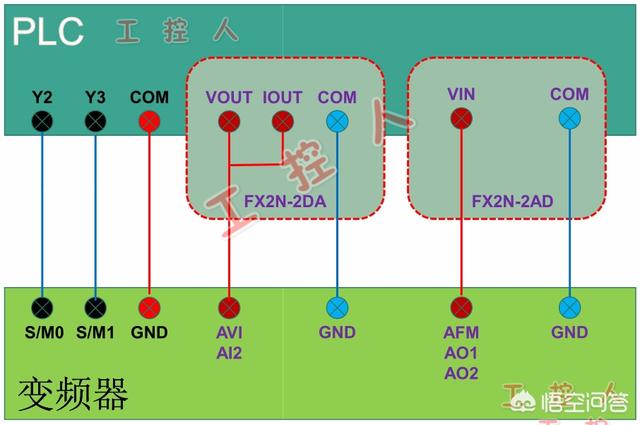 模拟量除了控制变频器的频率还能通过模拟量来读取变频器的运行参数如运行的频率、电流电压信号、功率、转速等。常用的模拟量信号有0-10v的电压信号和0/4-20ma的电流信号。我们知道plc的基本单元不支持模拟量处理,必须通过扩展的DA模块和AD模块实现信号转换和数据处理。DA模块是数字量到模拟量的转换主要用于频率的设定,AD模块是模拟量到数字量的转换主要用于数据的读取。plc与变频器的接线图如下,除去启停控制外,我们这里使用三菱FX2N-2DA和FX2N-2AD模块来控制变频器,具体的接线示意图如下: