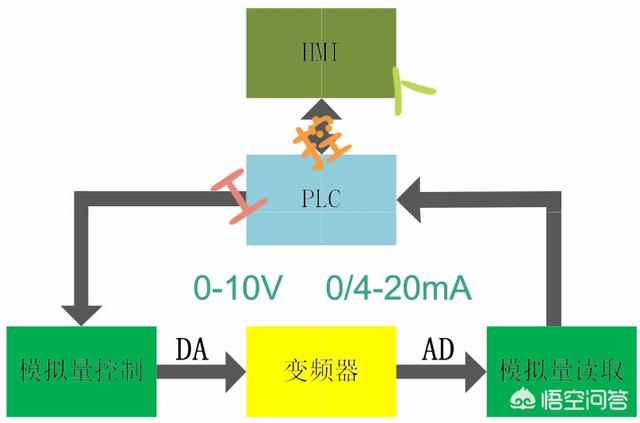PLC程序比较简单,没有复杂逻辑,模拟量输出分辨率也比较高,可以实现无极调节,保证运行稳定性,连接比较长时,要考虑导线上的压降。