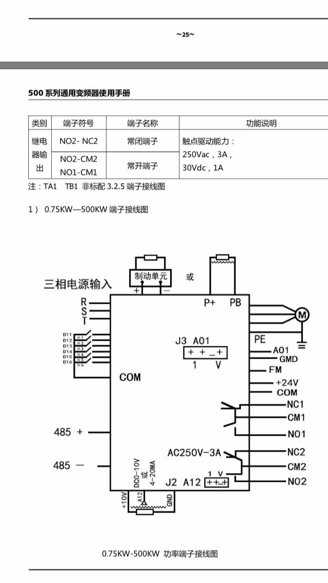附图为某变频器的接线图,可以看到,该变频器支持4-20mA,0-10v的模拟量输入控制,三菱PLC的模拟量输出可以接到0-10v的输入接口。