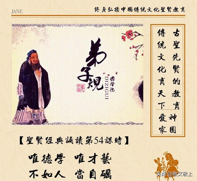 译文:只有品德学识才能技艺不如别人,应当自我激励,自我磨砺,自我提高。如果是穿着饮食不如他人,不要攀比忧愁。如果听到别人的批评就生气,听到别人称赞就欢喜,坏朋友就会来找你,良朋益友就会离你而去。听到他人称赞自己,唯恐过誉;听到别人批评自己,欣然接受,良师益友就会渐渐和你亲近。不是存心故意做错的 ,称为过错;若是明知故犯的,便是罪恶。知错改过,错误就会消失;如果掩饰过错,就是错上加错。