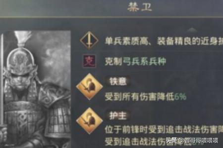 推荐兵种:“禁卫”。因为位于前锋,所以武将的生存就显得很重要。“禁卫”可以使武将受到的所有伤害降低6%,并且降低受到追击战法的伤害。