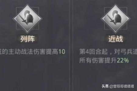 推荐特性:“列阵”+“近战”。“列阵”可以使主动战法伤害提高,而大营赵云一般是携带主动战法的。改版后的“近战”也可以造成物理系伤害了,虽然只针对弓兵,但是因为大营赵云为主要输出,所以还是推荐携带“近战”。
