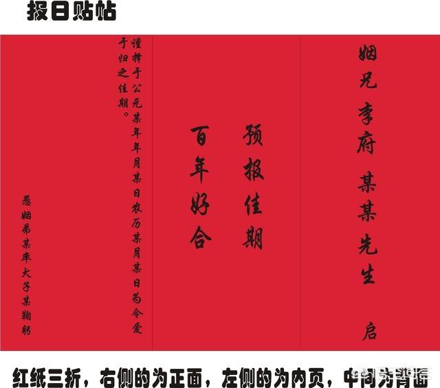 左侧为正文:谨择于农历某月某日公元某月某日星期几为令爱于归佳期