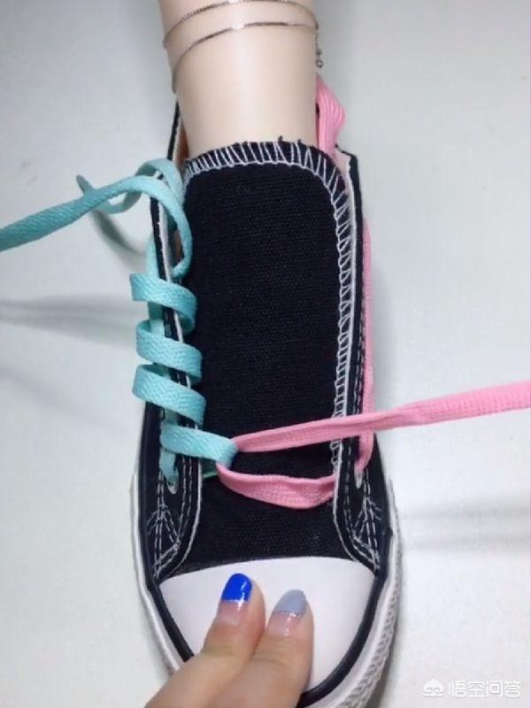 4.我们把红色的鞋带穿过蓝色的鞋带。