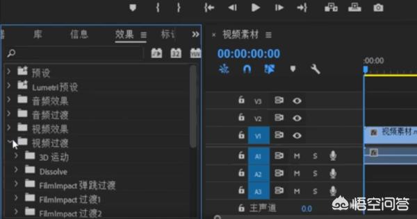 3、在pr中找到效果面板,如果没有找到的话我们可以在“窗口”菜单中勾选效果。在效果面板中我们重点关注2个方面,一个是添加视频特效的“视频效果”;一个是添加转场特效的“视频过渡”。我们在“视频过渡”中选择一种转场效果。